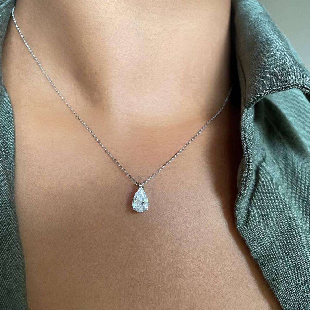 عقد ناعم يتدلّى منه حجر فاخر بقصة الكمثرى، تعكس لمعة راقية وبسيطة في آنٍ واحد التصميم الكلاسيكي والمينيمال يخلي القطعة مثالية لكل يوم أو مناسبة خاصة.