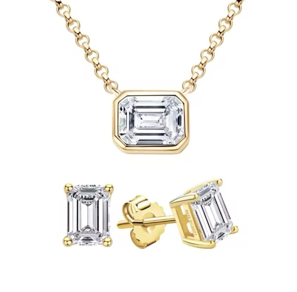 طقم فاخر يعبّر عن الأناقة الهادئة، بتصميم كلاسيكي بحجر موزنايت بقصّة الإميرلد المعروفة بلمعتها العميقة وخطوطها الهندسية النظيفة.