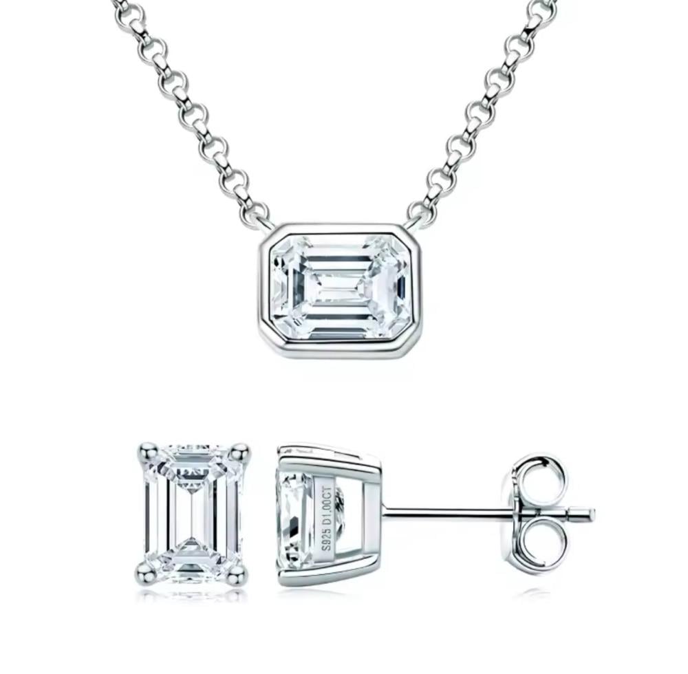 طقم فاخر يعبّر عن الأناقة الهادئة، بتصميم كلاسيكي بحجر موزنايت بقصّة الإميرلد المعروفة بلمعتها العميقة وخطوطها الهندسية النظيفة.