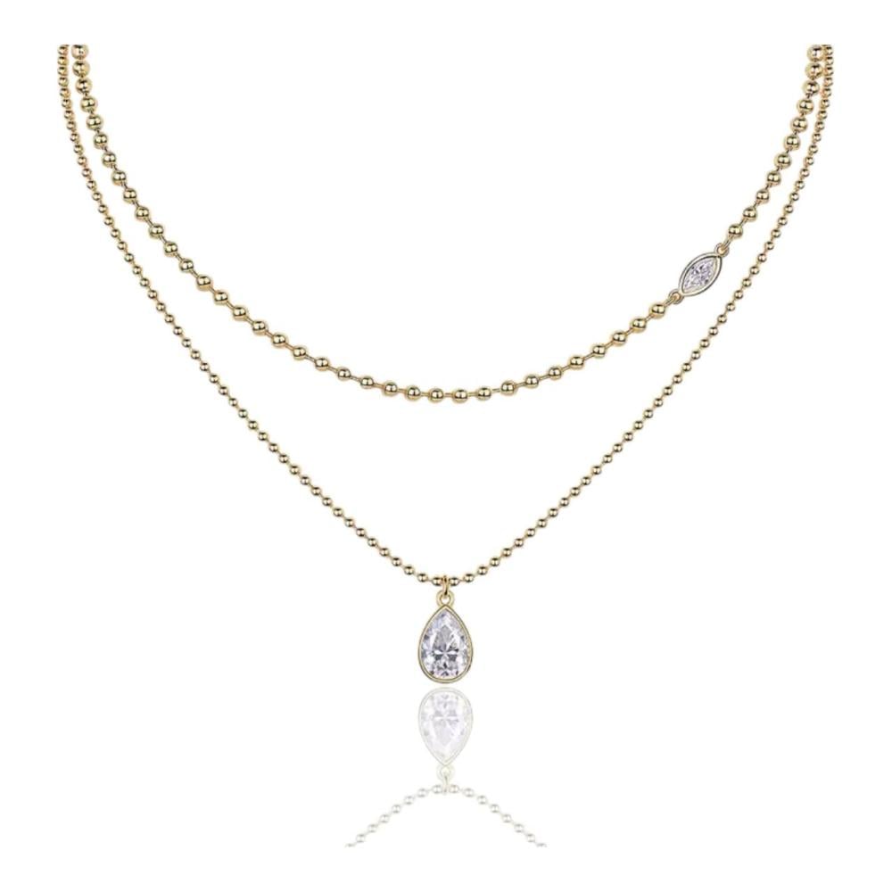 قلادة مزدوجة بطابع عصري وراقي، تتكوّن من سلسالين بتصميم كروي مطلي بالذهب، تتدلّى منهما تعليقة فاخرة بشكل قطرة ماء (Pear Cut) مرصّعة بحجر موزنايت بلمعة تحاكي الألماس.