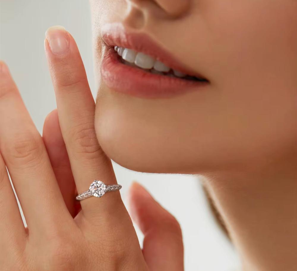تصميم فاخر يجمع بين الفخامة والنعومة، يتوسطه حجر موزونايت متألق بحجم لافت، يحيط به إطار زركون صغير مرصوف بدقة تعكس انسيابية الأجنحة ولمعانها.