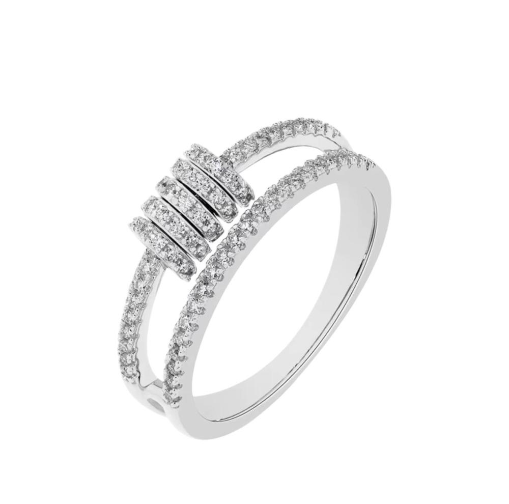 تصميم مزدوج يدمج البساطة بالفخامة، مرصّع بأحجار الموزونايت اللامعة التي توزعت بدقة على كامل الخاتم لإضفاء لمسة فاخرة لا تنطفئ.