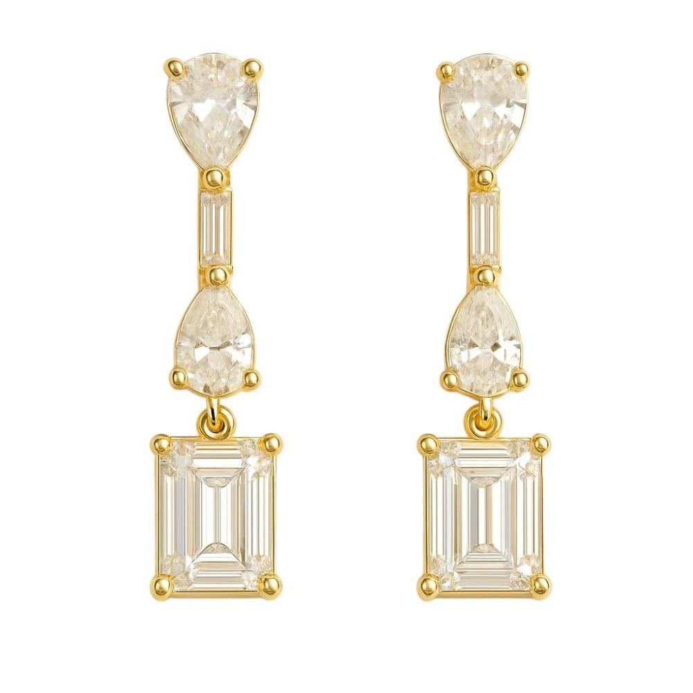 أقراط فاخرة بتصميم هندسي عصري يجمع بين قطع الكمثرى (Pear Cut) اللامع، والباغيت المستطيل (Baguette Cut)، ويتوّجها حجر مويسانايت بتقطيع Emerald Cut المميز، لتكوين قطعة فنية تعكس مزيجًا من الرقي والجرأة.