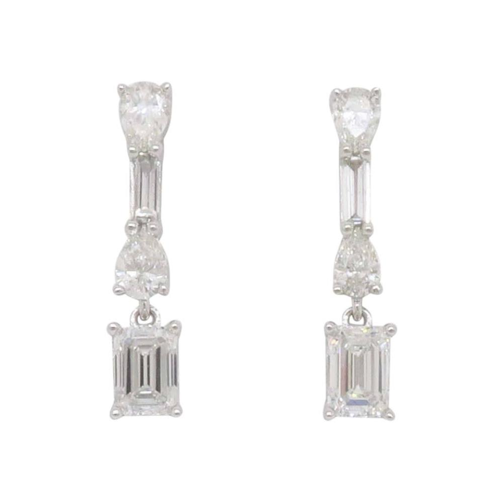 أقراط فاخرة بتصميم هندسي عصري يجمع بين قطع الكمثرى (Pear Cut) اللامع، والباغيت المستطيل (Baguette Cut)، ويتوّجها حجر مويسانايت بتقطيع Emerald Cut المميز، لتكوين قطعة فنية تعكس مزيجًا من الرقي والجرأة.