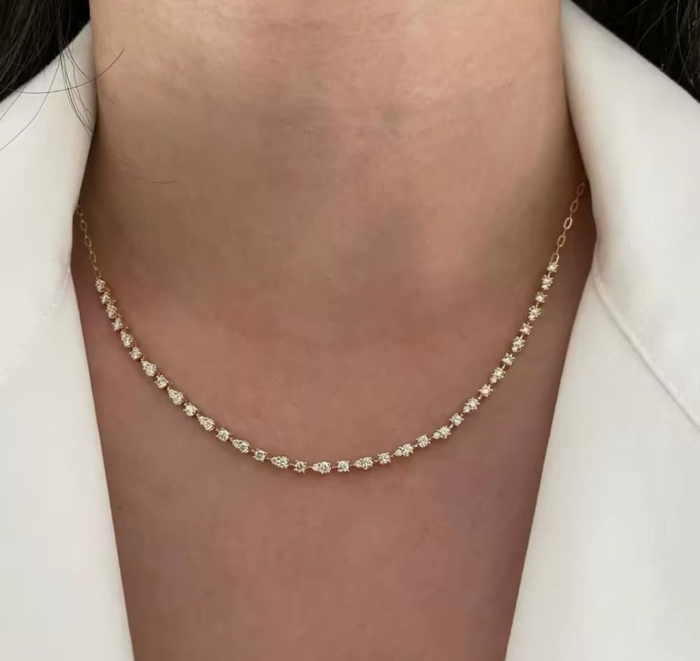 يتميّز العقد بصف من الأحجار المتراصة بحرفية عالية، تتناوب فيها القصّات المستديرة والكمثرية لإعطاء بعد بصري فاخر ولمعة متناسقة، مثالية للسهرات والمناسبات الكبيرة.
