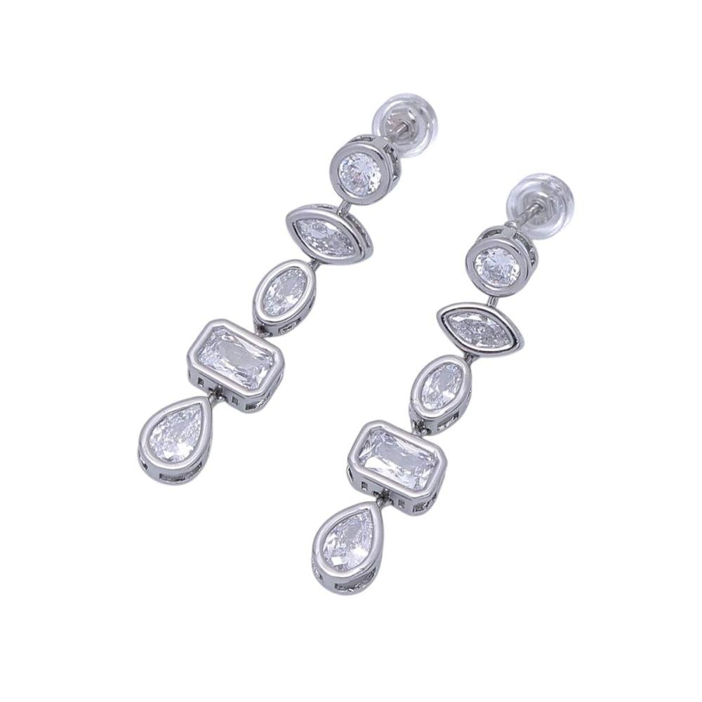 أقراط متدلية بتصميم فاخر يجمع بين عدة تقطيعات ماسية لامعة: Round، Marquise، Emerald، وPear Cut، مرتبة بانسيابية أنيقة تعكس تناغم فريد وبريق يخطف الأنظار.