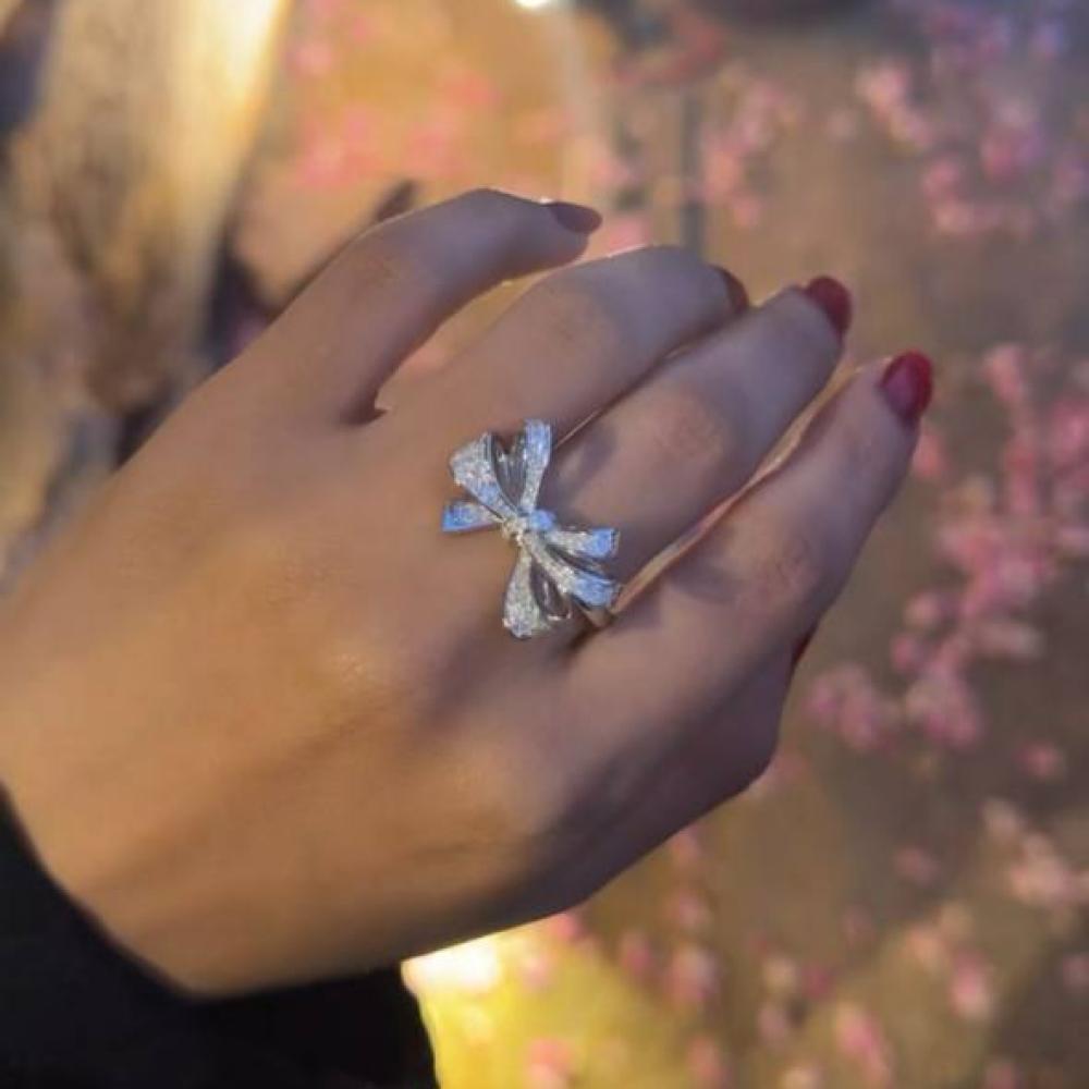 خاتم بتصميم فيونكة أنثوية راقية، مرصّع بالكامل بأحجار براقة تضيف لمسة لامعة على أي إطلالة. تفاصيله المنحنية تمنحه مظهراً ناعماً و جذاباً يناسب السهرات والمناسبات الخاصة.