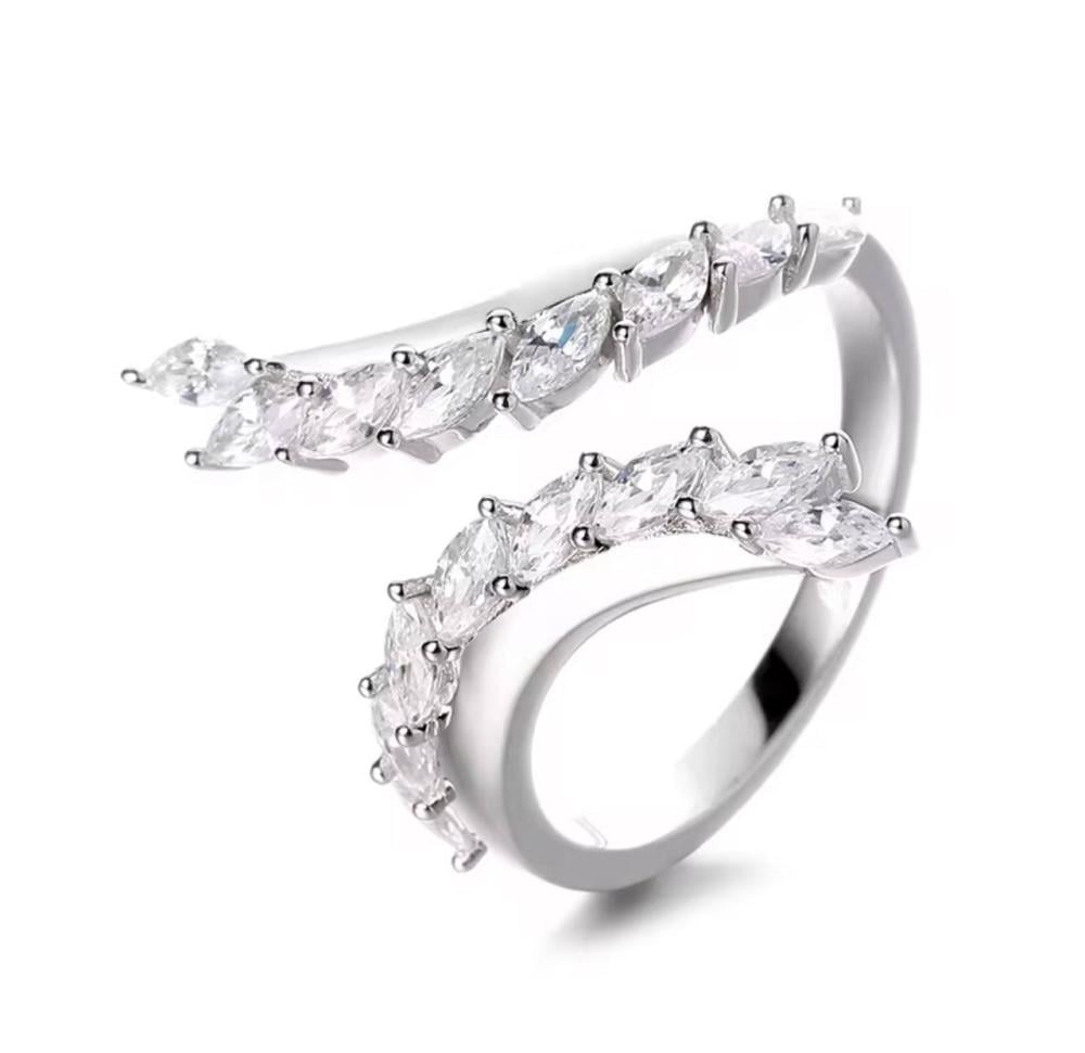تصميم مميز بحركة لولبية ناعمة تلتف برشاقة حول الإصبع، مرصّع بأحجار الموزونايت اللامعة بقصّات ماركيز تضيف بريقاً راقياً يوحي بالفخامة العصرية.