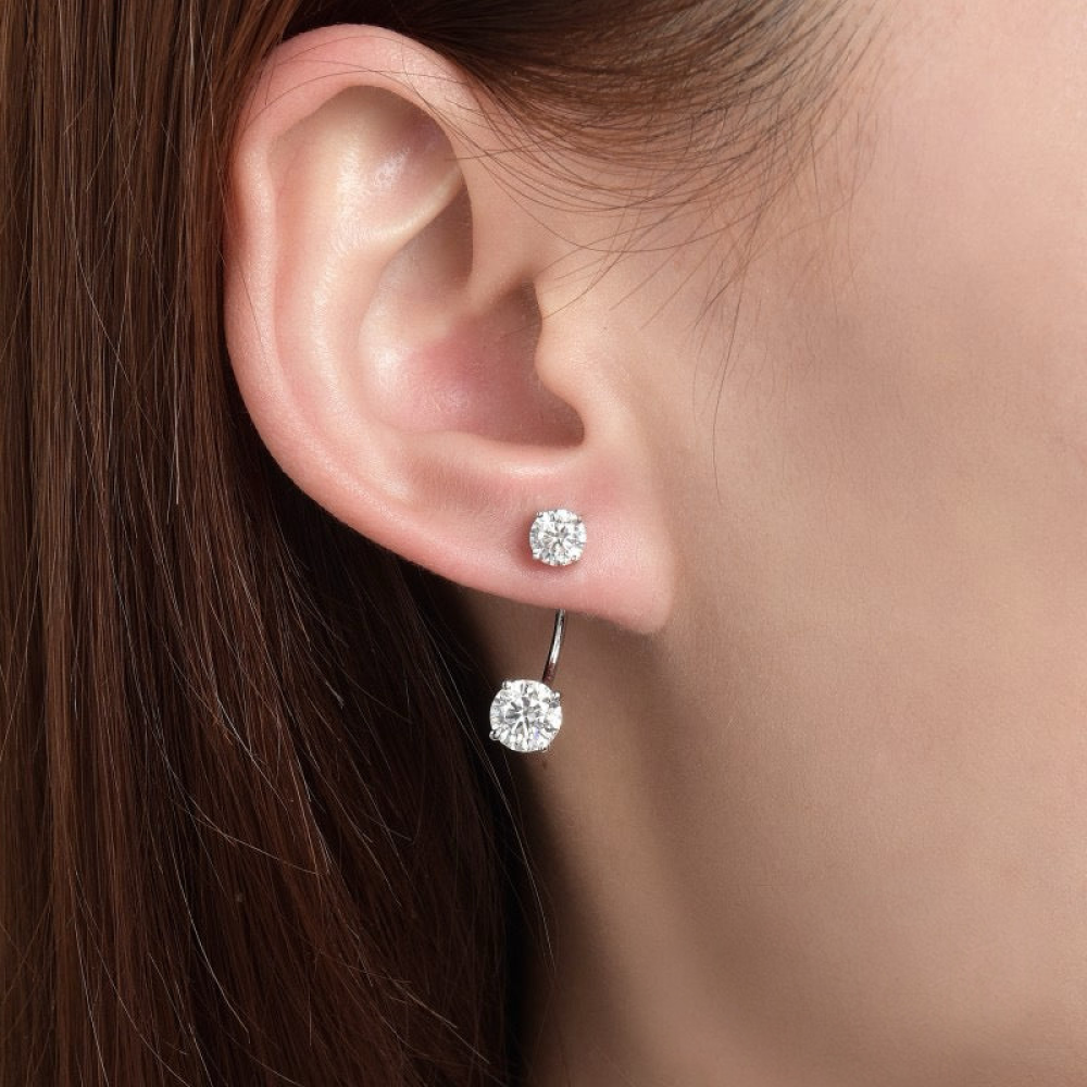 كل قرط مرصع بأحجار موزونايت فائقة اللمعان بلون D ونقاء VVS1، حيث يزين الجزء العلوي حجر بوزن 0.30 قيراط، بينما يتدلى منه حجر أكبر بوزن 0.50 قيراط يمنح إشراقة إضافية ولمعان يخطف الأنظار.