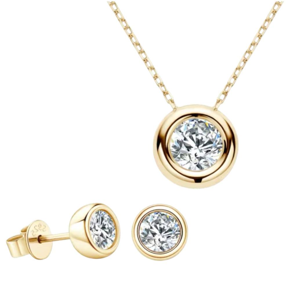 طقم راقي بتصميم سوليتر دائري، يتكوّن من عقد وأقراط بتثبيت Bezel يحيط بالحجر ويبرز لمعته بأسلوب ناعم ومينيمال. مثالي للإطلالات اليومية أو كهدية راقية ما تُنسى.