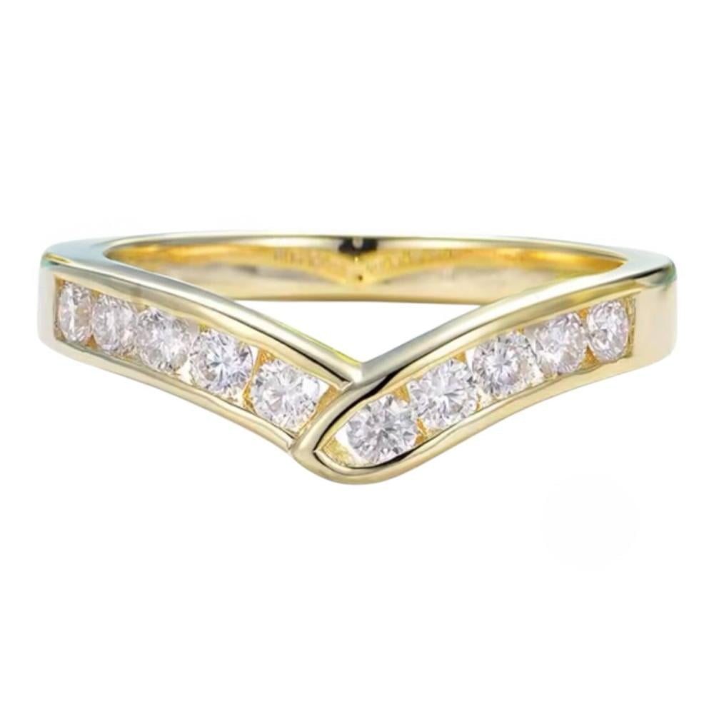 خاتم أنيق بتصميم حرف V يمنح اليد مظهر أنثوي وانسيابي، مرصّع بأحجار لامعة مصفوفة بدقة على جانبي الانحناءة، لتعكس الضوء بشكل ساحر وتضيف لمسة من الجرأة والرقي.