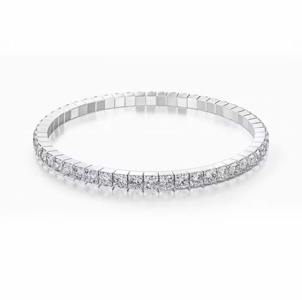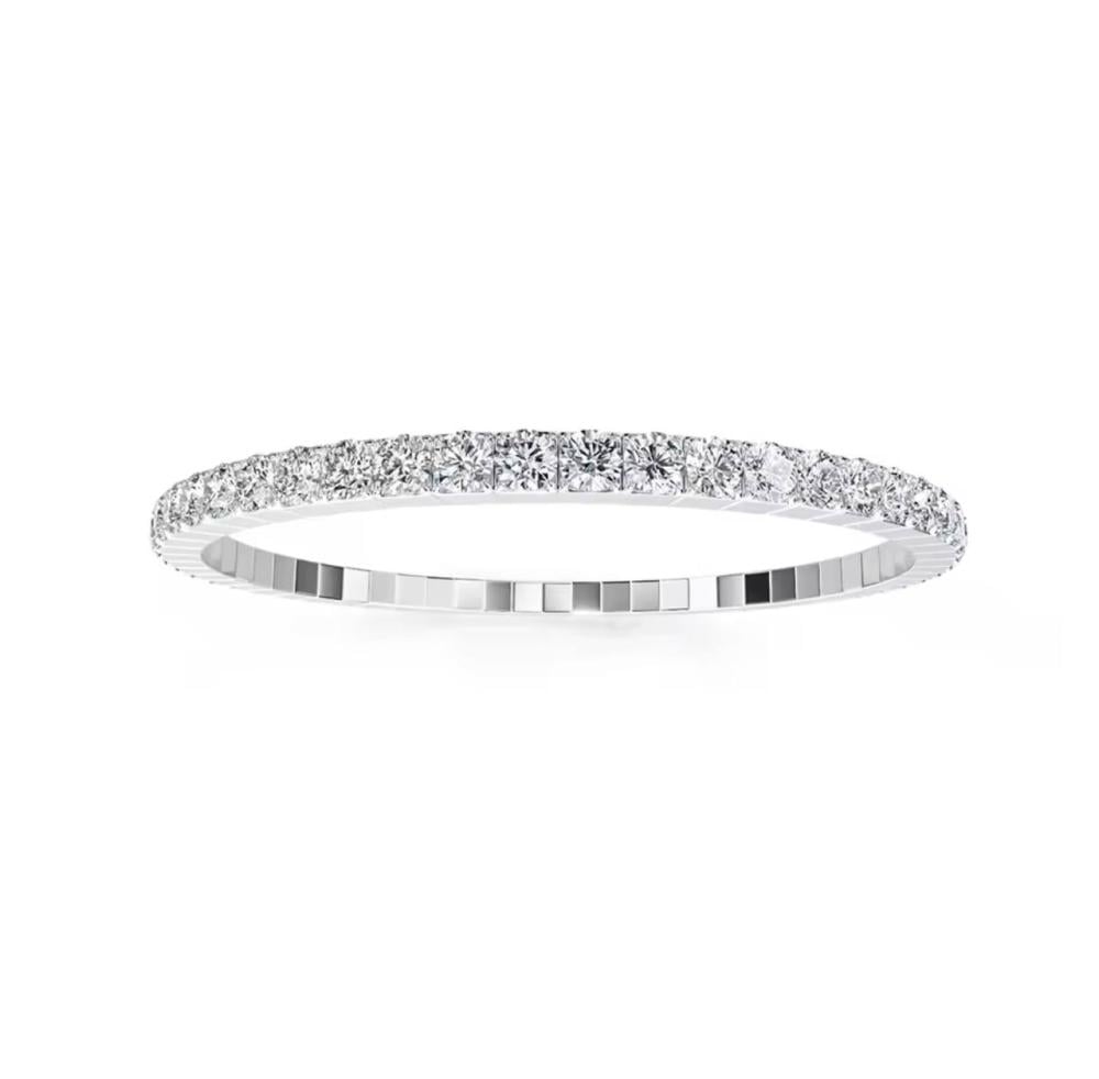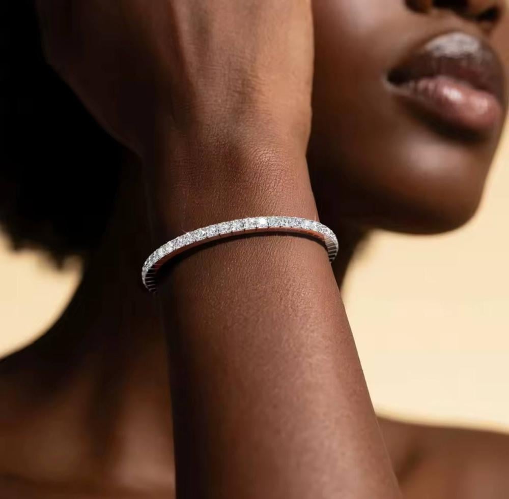 لمسة عصرية على السوار الكلاسيكي سوار موزنايت تينس المرن بالحبل المطاطي يجمع بين البريق الفاخر والراحة اليومية. بفضل تصميمه المرن بدون مشبك، ينزلق بسهولة على المعصم ويمنحك لمعانًا يخطف الأنظار بأحجار الموزنايت فائقة الجودة. مثالي للبس منفرد أو للتنسيق مع أساور أخرى.