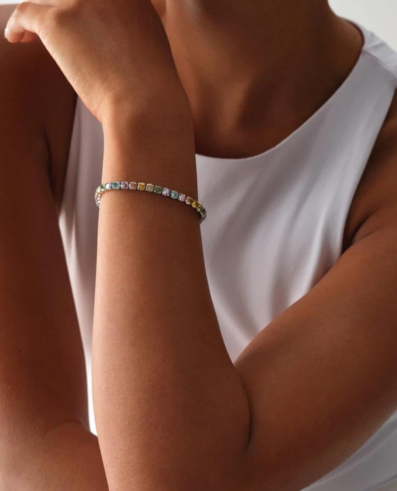 إسوارة تنس فاخرة مرصعة بأحجار الموزونايت الملون الذي يتميز بلمعانه الساحر وتدرجات ألوانه المبهجة. تصميمها العصري يجعلها قطعة مثالية تضيف لمسة أنثوية مرحة على إطلالتك اليومية أو مناسباتك الخاصة.